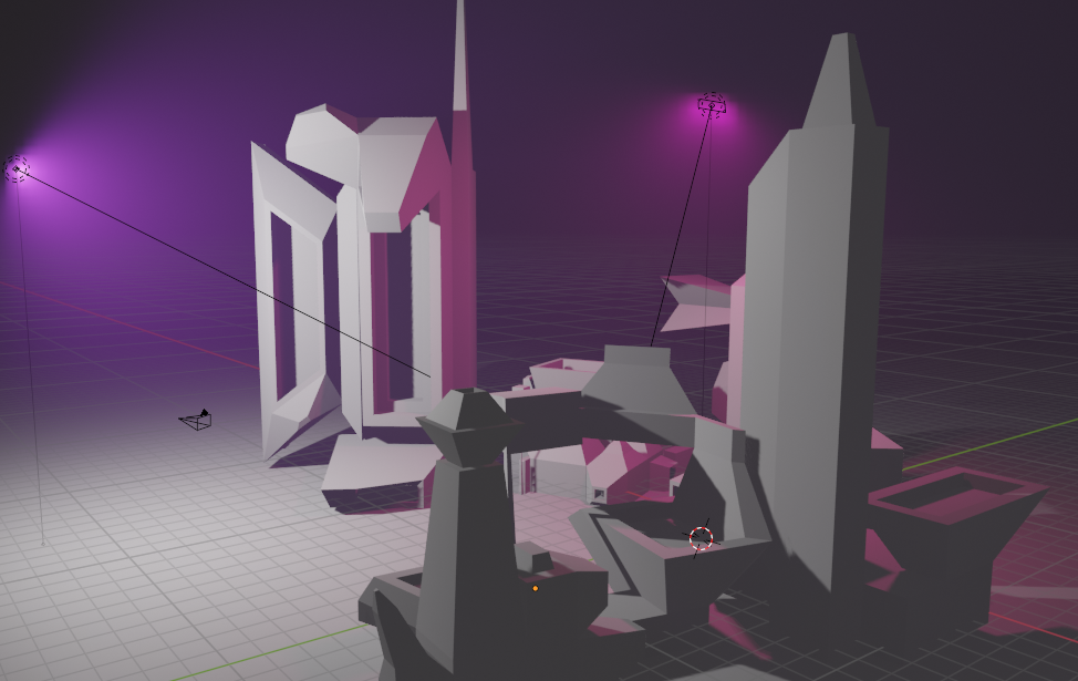 En mi caso, en cuanto a las luces he escogido colocar dos de colores rosa y morada, sin demasiada intensidad para dar un ambiente neblinoso. Además, las he querido colocar bastante arriba para que iluminen todo el espacio y no sólo una parte de las estructuras.