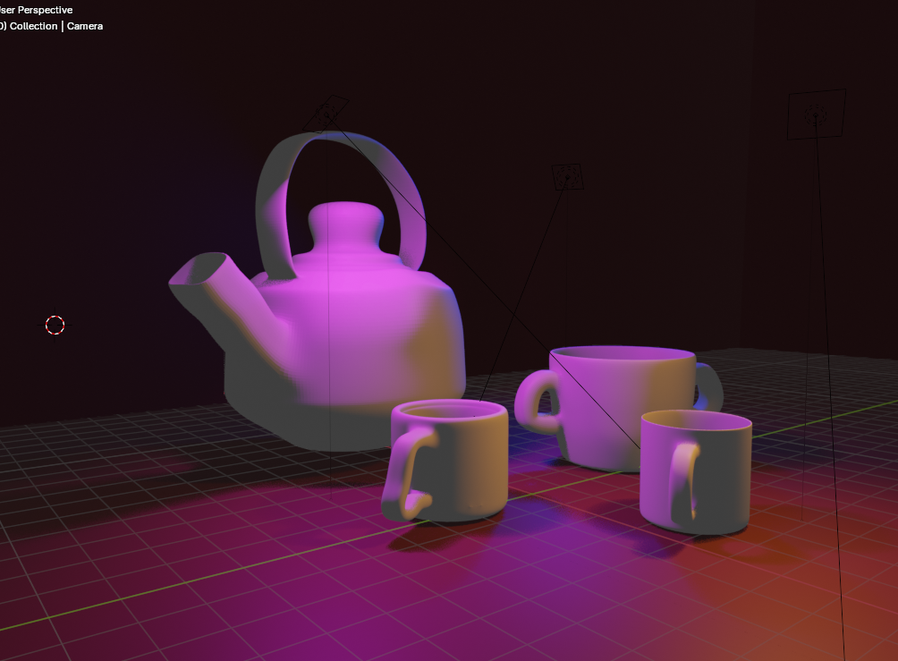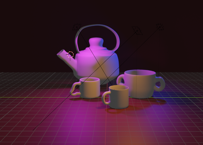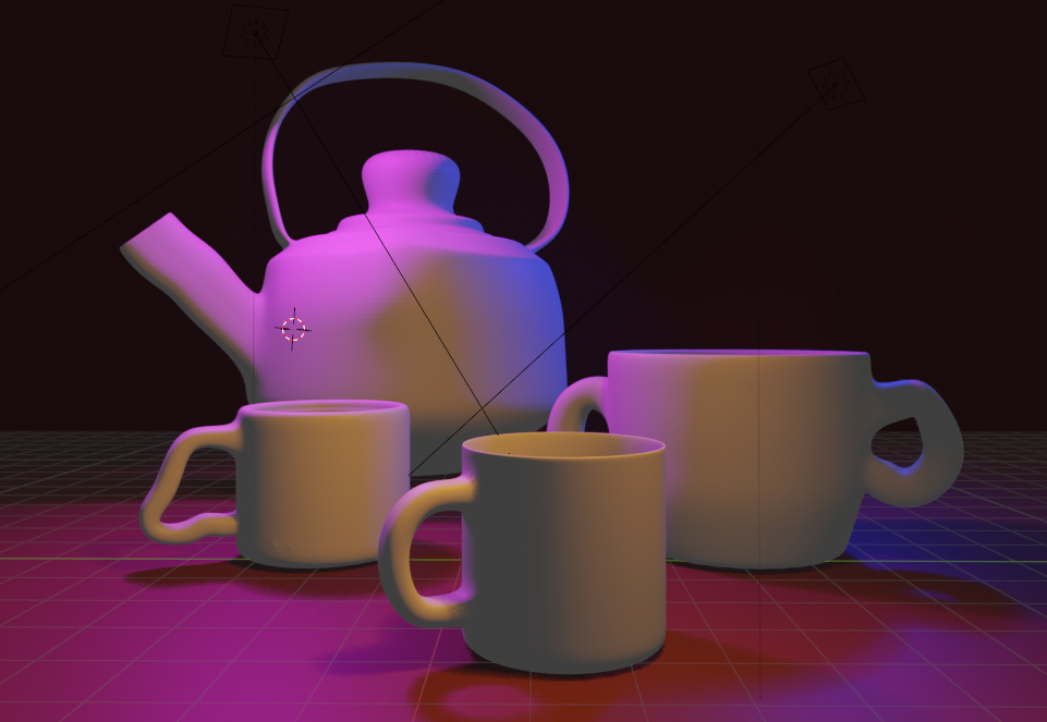 En mi caso, he decidido crear tres tazas de distintos tamaños y distintas azas junto con una gran tetera dando mayor contexto a las construcciones. He añadido luces de color naranja, rosa y azul para crear contraste y una iluminación interesante en el render final.