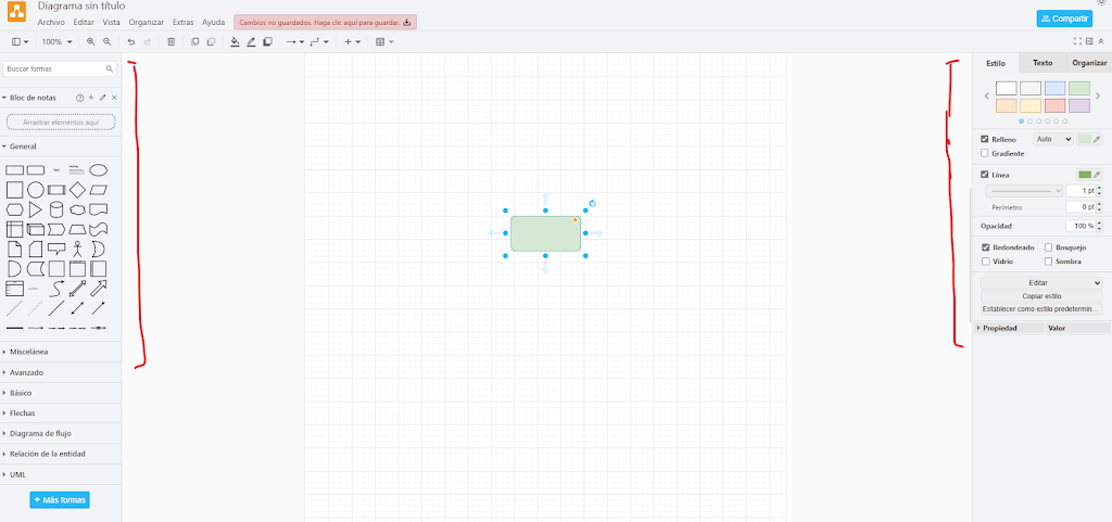 En el lado izquierdo pueden agregarse más formas para que el diagrama de flujo siga su curso dependiendo de por donde se quiera llevar. En el lado derecho pueden editarse esas formas, cambiando el color, el grosor de la línea de contorno, etc.