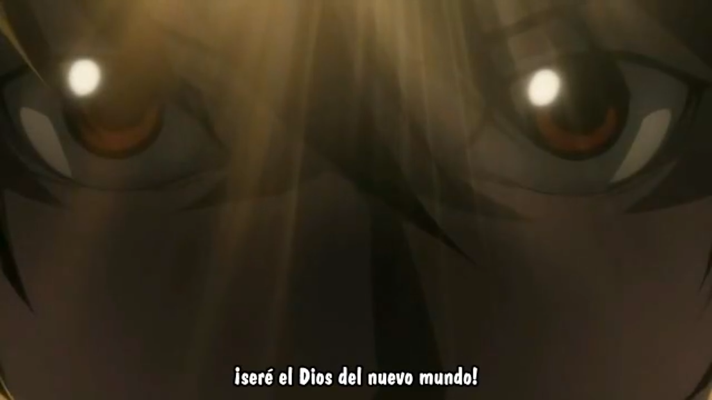 Fragmento de Kira afirmando que será el Dios del nuevo mundo. (Capítulo 1 del anime, minuto 21:02)